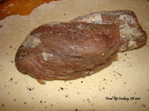 - Place the fillet on the dough, and wrap the dough firmly and snugly around the meat, making sure it is very well sealed. Use a little water to help the dough bind together at the closing edges. Make sure there are no gaps or cracks