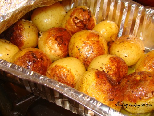 - Place the washed, unpeeled baby potatoes in a tinfoil roasting dish