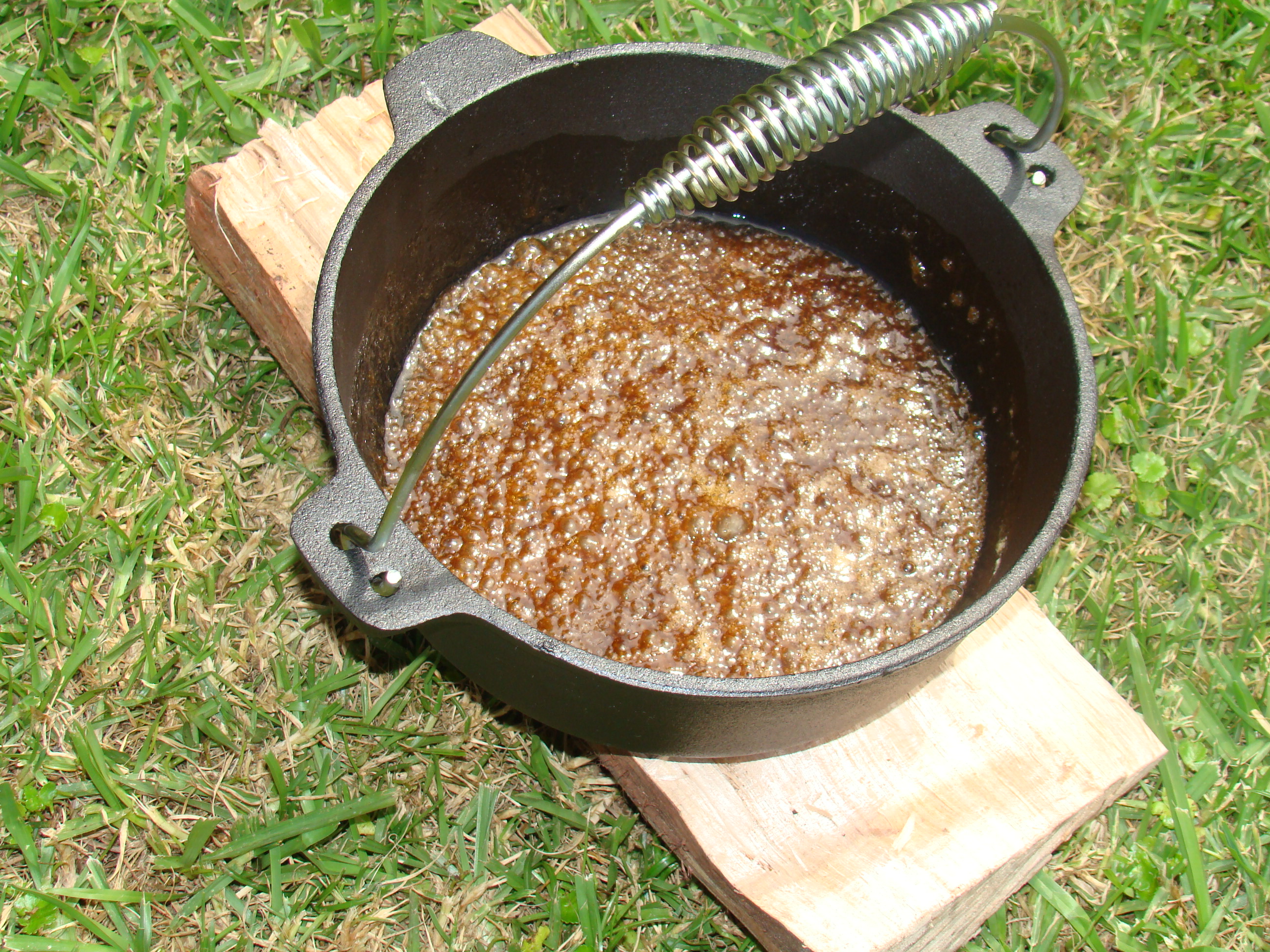 • In the pot in which you intend to bake the rolls, melt the butter and brown sugar over the fire, don’t stir