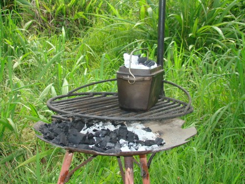 I use my little rectangular bread pot for the savoury rolls and a small round pot for the sweet rolls – if your pots have lids with a rim to hold some coals on top, even better. You will also need a hot bed of coals for cooking – we like to place the pots on top of the grid, not directly in the coals, which can lead to scorched bread.