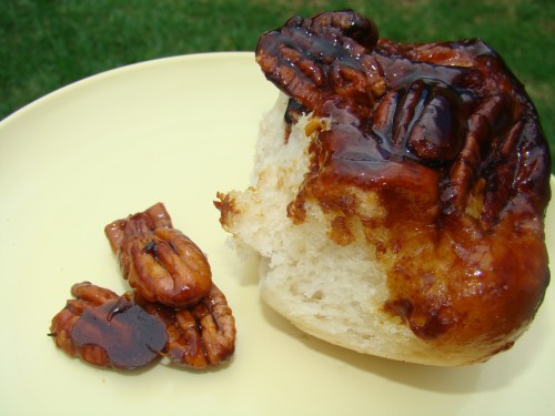 These are absolutely delicious, and will be eaten before they get a chance to cool.  Now with the other half of the dough, make some sweet pecan caramel buns for dessert.
